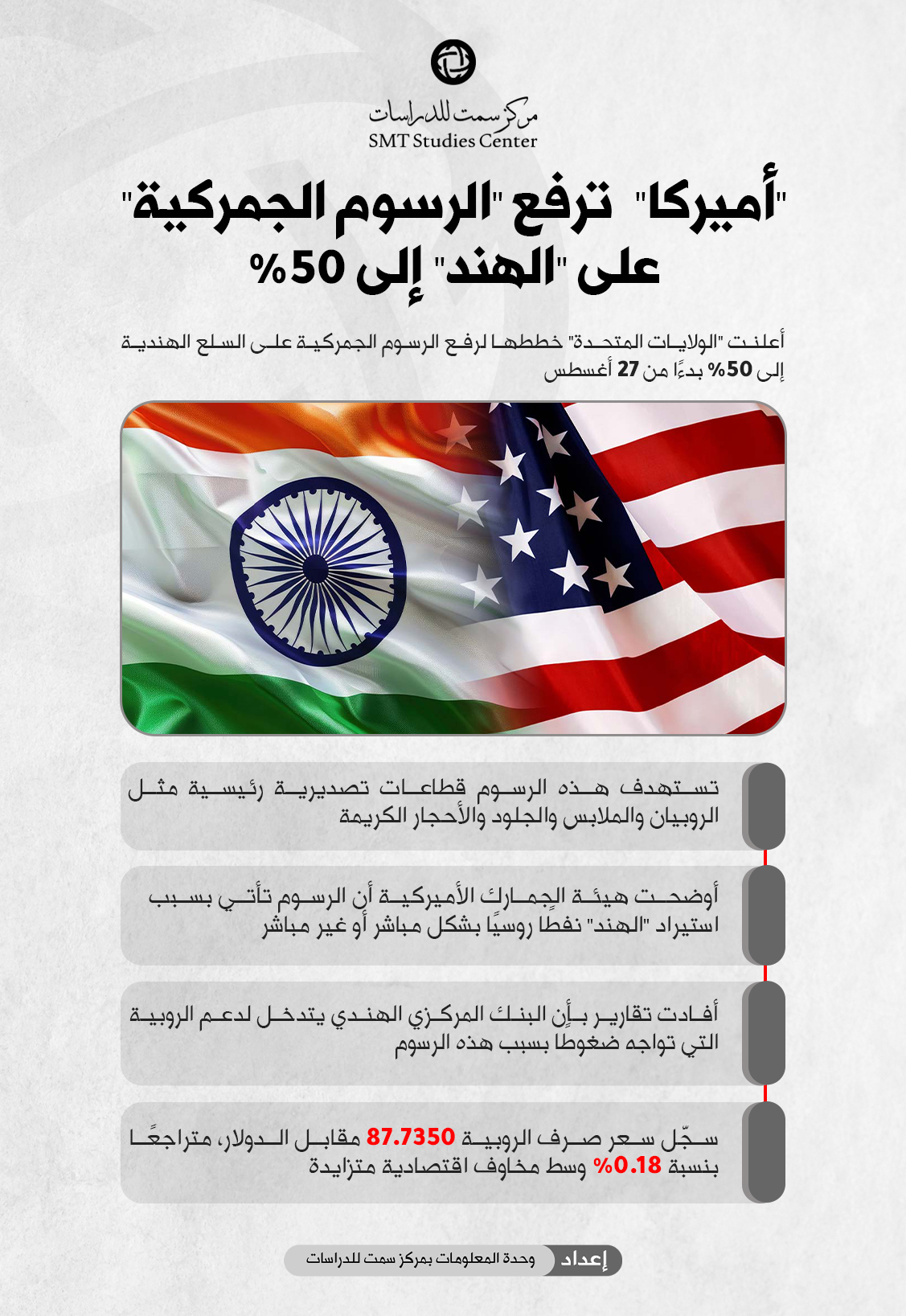 مركز سمت للدراسات مركز سمت للدراسات - “أميركا” ترفع “الرسوم الجمركية” على “الهند” إلى 50%